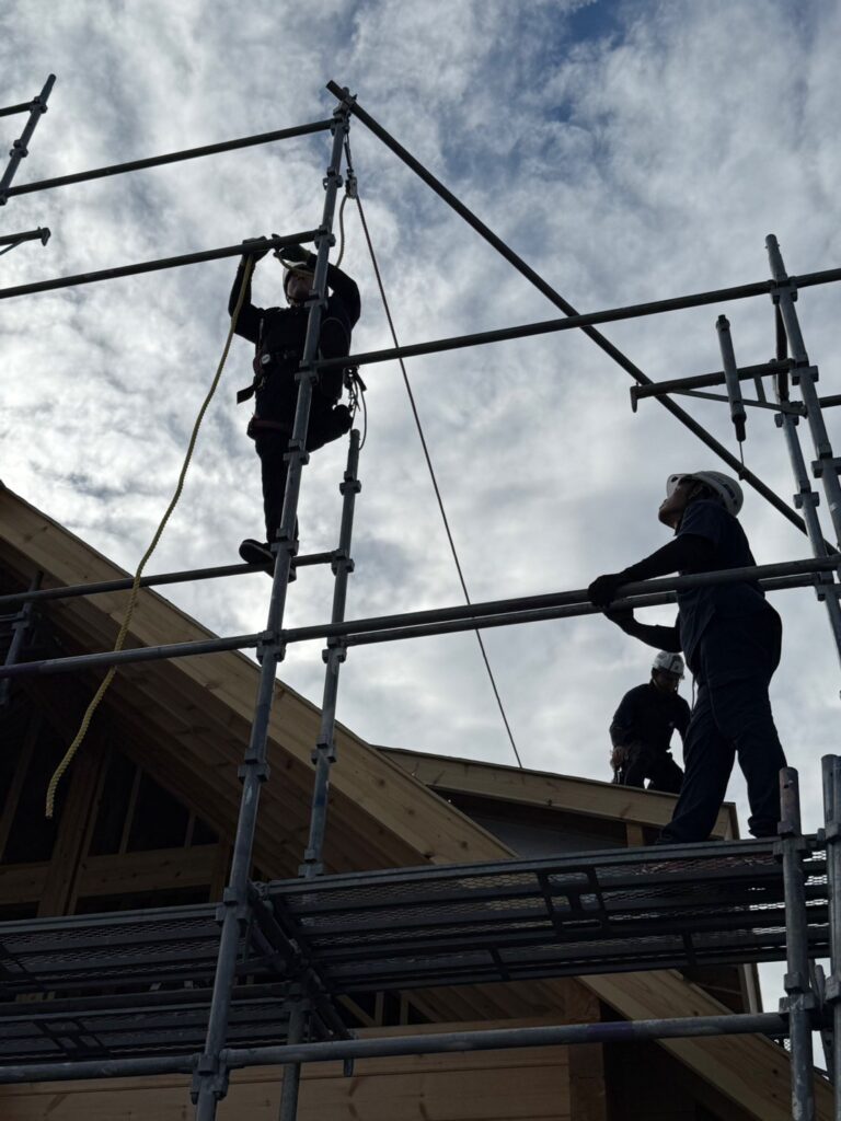 私は地上から見学していたのですが、屋根の勾配に沿って足場がきれいに組まれていく様子に感動!